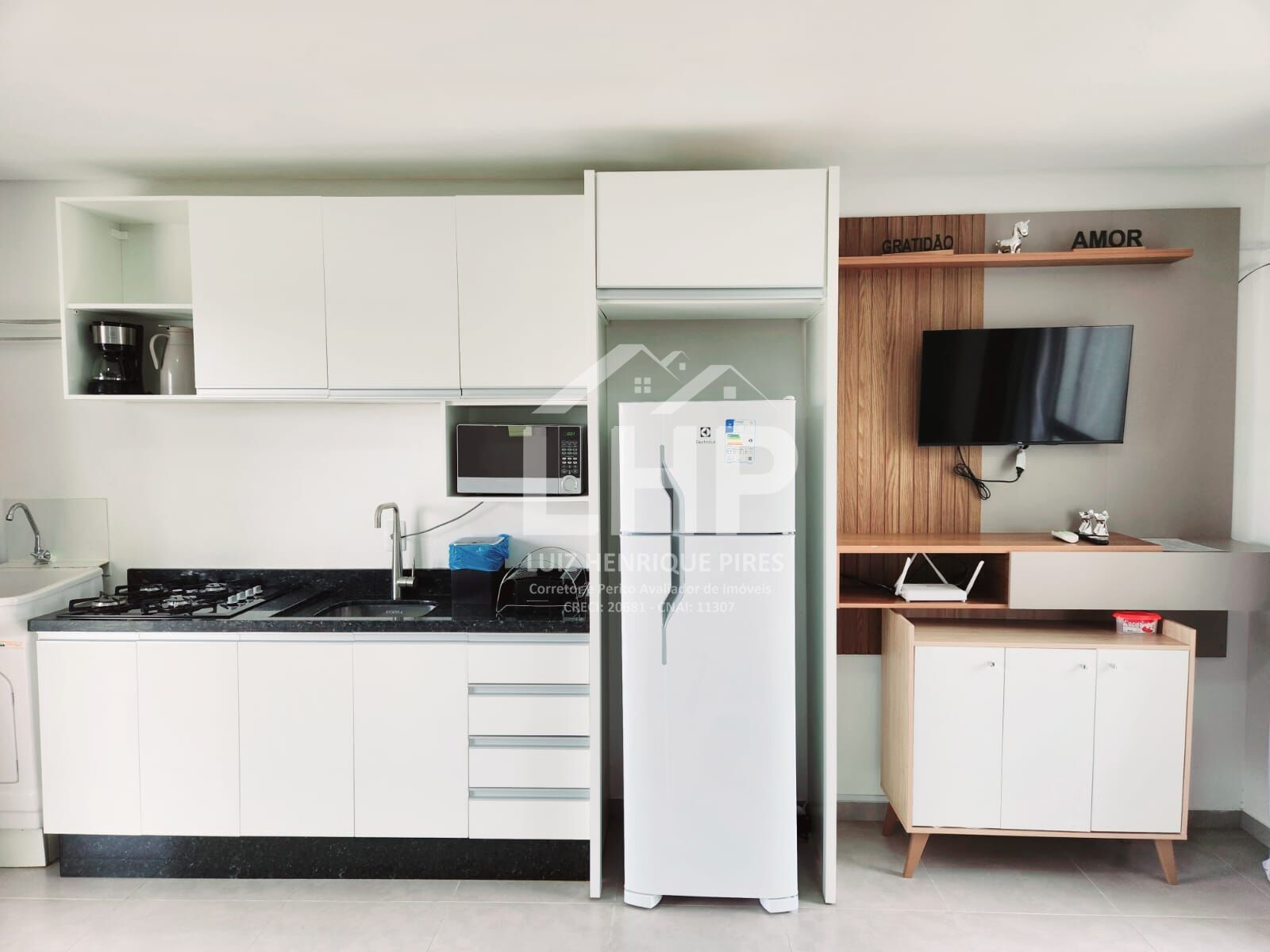 Cozinha completa: • Móveis planejados com balcão em granito, armários e gaveteiro • Cuba e torneira em inox• Geladeira, fogão cooktop, micro-ondas, cafeteira e utensílios • Mesa de jantar com 4 cadeiras • Tanque para lavar roupas • Cama box de casal • Sofá-cama • TV Smart